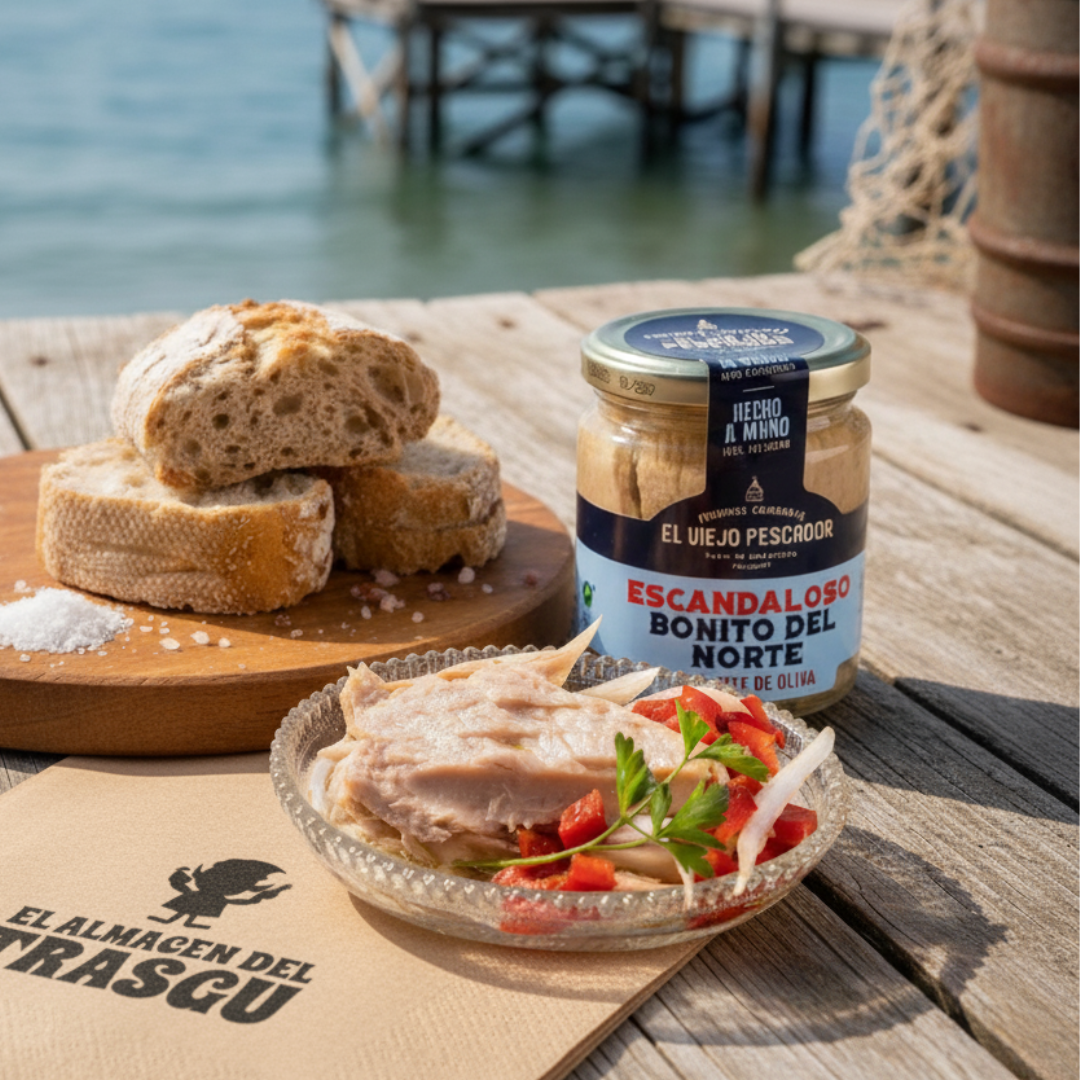 Bonito del Norte limpio, entero y jugoso, conservado en aceite de oliva y elaborado en Tapia de Casariego por una pequeña conservera familiar.
